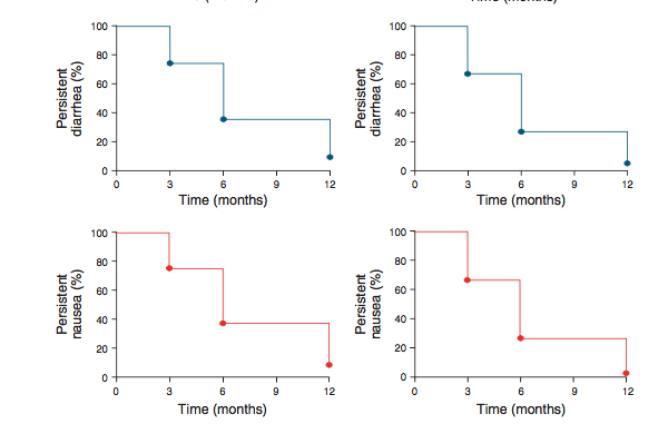 Post-infectious irritable bowel syndrome (PI-IBS) may develop in 4 – 31 % of affected patients following bacterial gastroenteritis (GE), symptoms persist after successful treatment in some for months as shown below taken from this 2005 article. Note that at 1 year, there are some still showing symptoms.