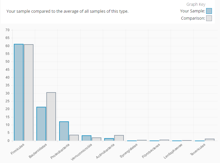 - Akkermansia: 170% of normal, this is associated with weight gain and inflammation.