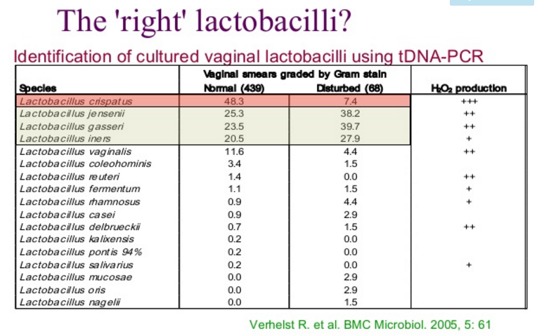 - “Lactobacilli were identified in 215 (71%) of 302 women. The 3 predominant species identified were L. crispatus (32%), L. jensenii (23%), and lactobacillus 1086V (15%). Among these species, 95%, 94%, and 9%, respectively, produced H2O2. Surprisingly, L. acidophilus was not detected in any women. ” [1999] [2012]