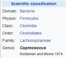 In Ian Lipkin et al 2017 study, low Coprococcus Catus was reported (on average). [Index to all posts on Study] comparing all CFS patients against normal controls. As with many families, it is little studied in the past with just 5 PubMed citations despite being discovered in 1974.