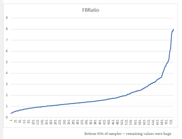 About 91% have ratios (you need values of both to get a ratio). We see a major rapid increase in the ratio with those in the highest ratio.