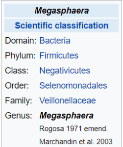 - ” the presence of … Megasphaera elsdenii… were independently associated with bacterial vaginosis as was the absence of Lactobacillus and Peptoniphilus [in human females]. ” [2001]