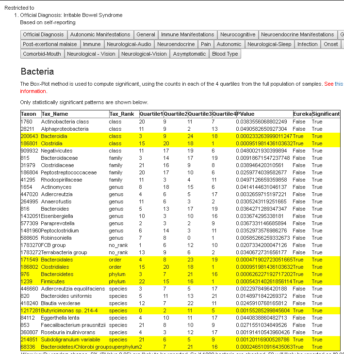 This page is now updated to be easier to use as well as doing better statistics (well keeping things understandable). The initial page shows some random bacteria that is flagged at the 5% by chance level, but not truly significant (Eureka!). 5% of a thousand bacteria is 50!.