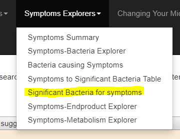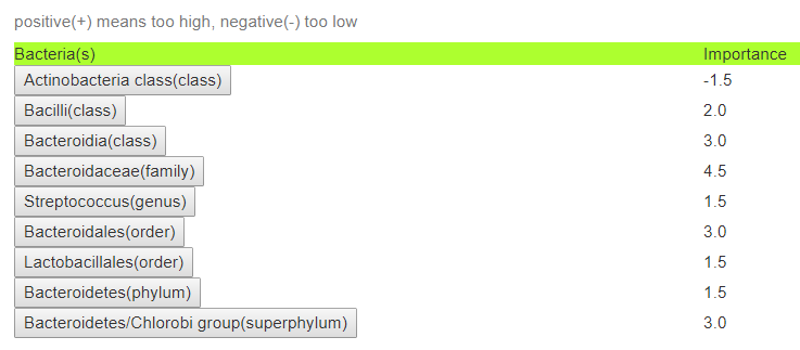 This is taking the associations of bacteria to symptoms found for the entire population and applying it to the symptoms you have recorded and your uploaded microbiome.
