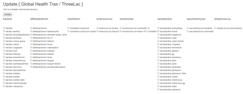 The next screen lists probiotics by their genus and then species. A few special strains ones are explicitly added.