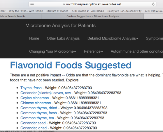 I write to report our early success through your new site, tailor-made for followers who log on. My daughter (CFS 5-6 years, house-bound) rigorously follows the diet suggestions. Four weeks ago she began on the Jadin regime for a first cycle of two weeks of Doxycycline with miserable results, and straight after, giving up on probiotics because she reacts to all the fillers, went on her tailor-made Flavonoids suggestions (as in screenshot) and after a week of lashings of Thyme,(tea, raw and as a herb), began to “wake up”, staying awake most if not all of the day, chatty, sociable, clear-headed, able to more fully participate in ordinary life , and suddenly showing more physical strength than she’s had for years put together. We live on a muddy river, boat-access only, and coming home on a dark night, she, the only person in the appropriate place, strained out to reach our jetty and single-handedly pulled our 18 foot cabin cruiser across the mud to its berth! She had no punishing delayed exhaustion next day. Who would’ve predicted those tiny leaves could do so much good? (She also has lashings of D ribose to counter the bitterness of the Thyme).