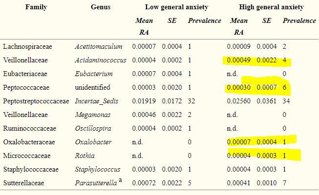 Low Veillonellaceace family shows up again, it seems to be haunting my recent posts. This time it is the Megamonas genus which is only seen in 10% of samples uploaded. Remember that the above is using averages, thus a n.d. means that no one with high anxiety had any!