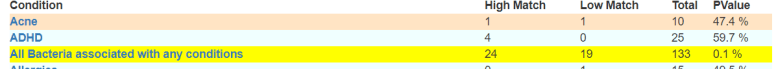 Traditionally, a value is 0.05 (5%) or less is needed to be significant (or, of concern). There is one change in 20 or this being random. If you check 20 conditions – you would expect one to be at 0.05 or below ( 5% x 20 = 1). So you need to use a bit of common (statistical) sense if some odd condition appears. On the other hand, if a suspect condition shows up very strong then you may wish to get definitive testing (if it is available). Not responsible for MD’s confused faces when you ask for testing because you microbiome results suggest it may be wise.