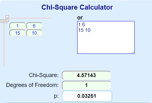 For the example below, we pretend we have 16 bacteria. We expect 1 to be found(matches) and 15 not to be found. If we find 6 matches and thus 16-6 -= 10 non-matches, we can compute the odds of this happening at random. Around 0.032, 3.2% or 1/0.032 => 1 in 32 times.
