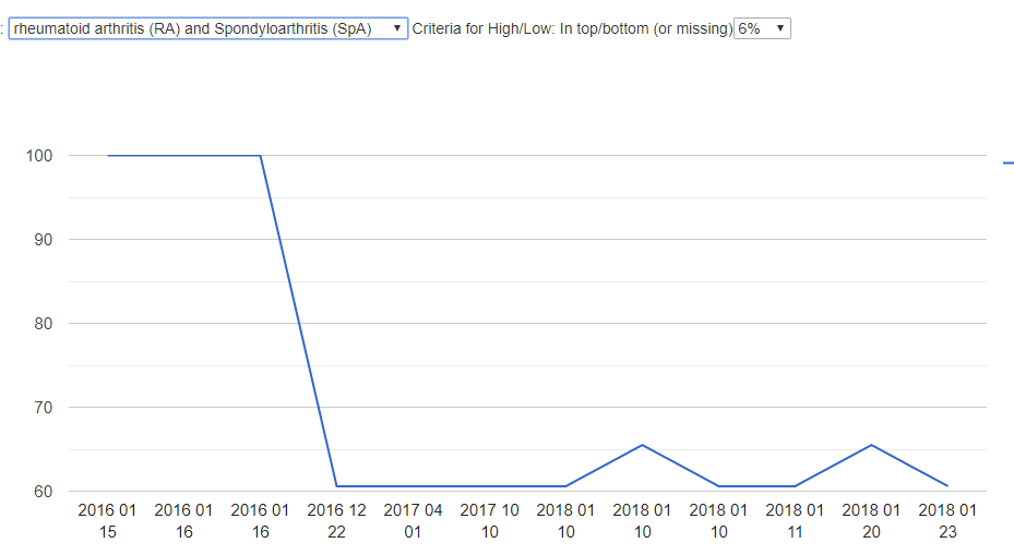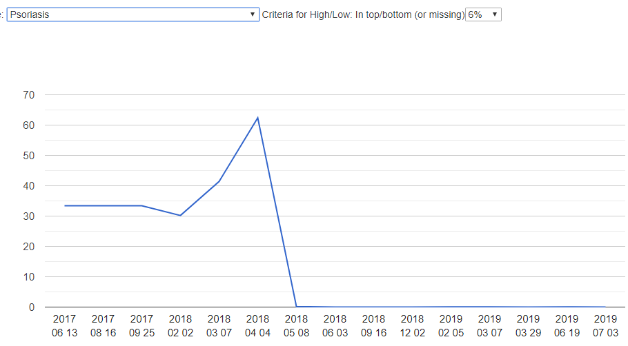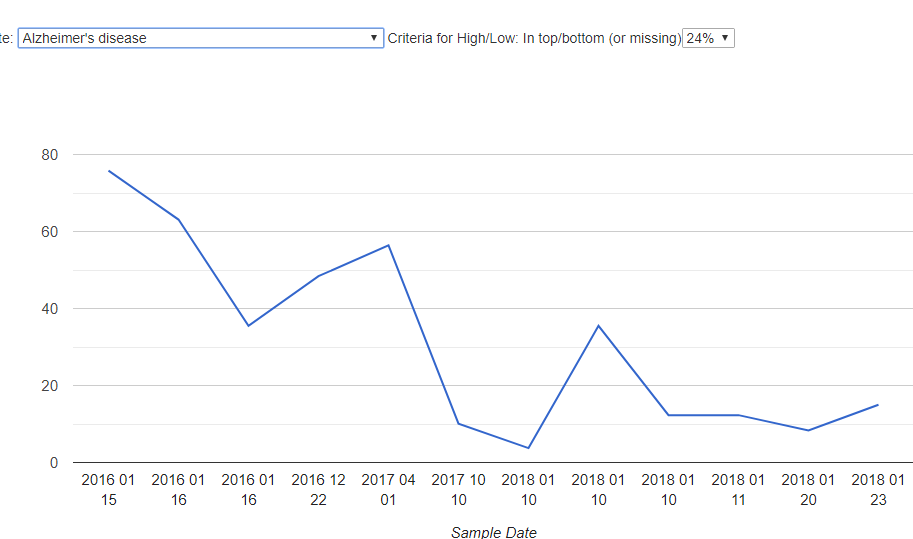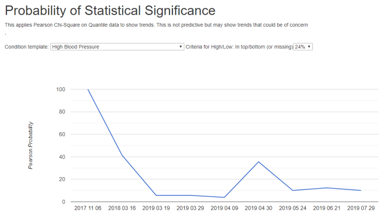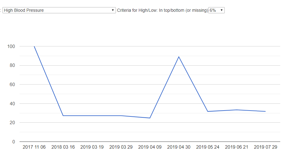 My recent visit to an urgent care has the physician concerned about high blood pressure. Usually, I have not been concerned about that because I have had a history of low BP with POTS. With the recent work on symptom templates (see this post), I wrote a time plot page to plot the pearson chi-square probability over time of each one of our many disease profiles.
