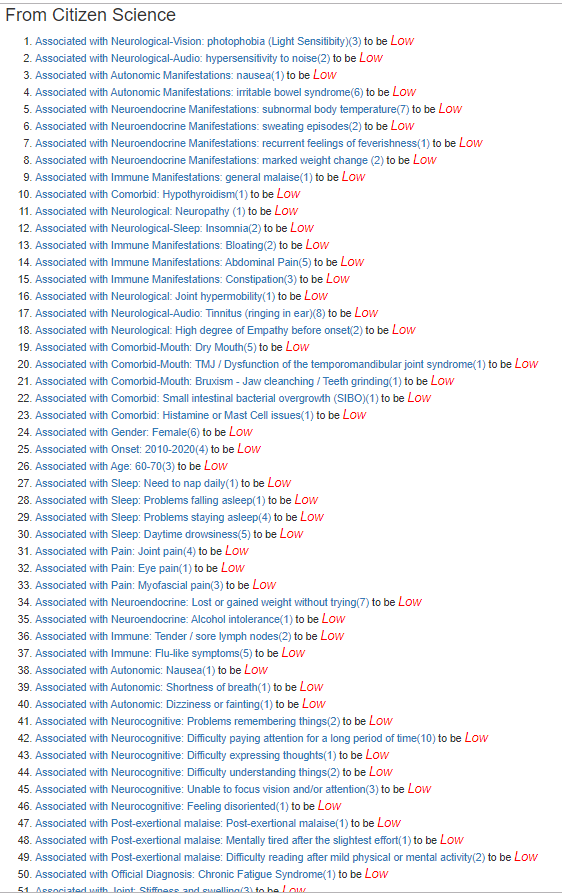 Going over to Faecalibacterium (3 citations) – another LOW one, we see a more massive symptom list, many many are in the classic ME/CFS diagnosis list.