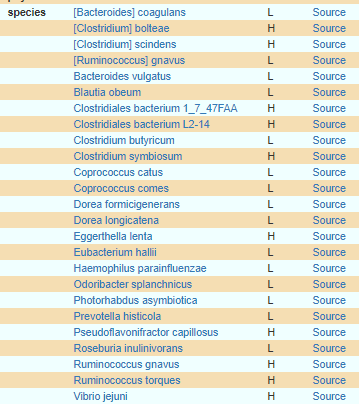 In terms of published studies, I have assembled a dynamic list on my website (not verified and subject to data entry errors) shown below for genus level and above. When an item is repeated on multiple lines, this means that we have multiple studies report it. H-High, L- Low, B- High or Low (outside of normal)
