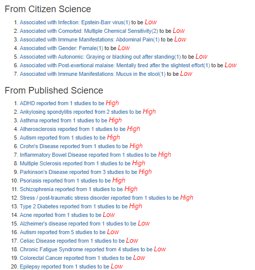 One list of bacteria comes from studies on patients that conform to strict definitions of ME/CFS. The other list of bacteria comes out of the symptoms people self-report and their 16s microbiome results. We have a very strong agreement with the results coming from two independent approaches.