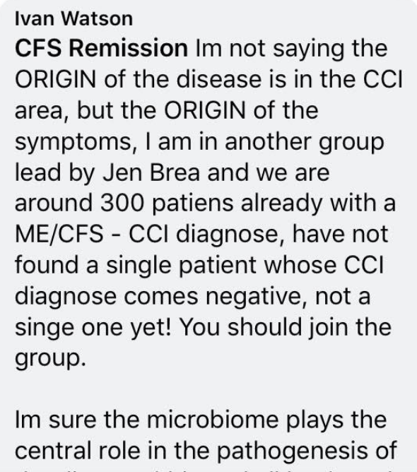 Reading the up to date, with extensive documentation on ME-Pedia article on CCI I am left with the impression that it will be found in many patients and that this would be implied by the name of ME which means myalgic encephalomyelitis. Encephalomyelitis is inflammation of the brain and spinal cord. This was the original name and accurately describes typical findings of MRI and SPECT scans (see this post). ”