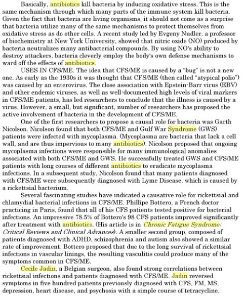 A reader asked me to compile a list of of published studies and articles on the use of antibiotics with ME/CFS. Note that with gut dysbiosis as the model, the choice of antibiotics may depend on the details of the dysbiosis (this a 16s or shotgun GI report is suggested. Xenogene.es offers excellent reports).