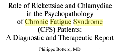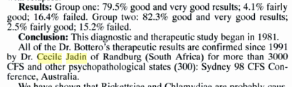- Role of Rickettsiae and Chlamydiae in the Psychopathology of Chronic Fatigue Syndrome (CFS) Patients (2000) Results: Group one: 79.5% good and very good results; 4.1% fairly good; 16.4% failed. Group two: 82.3% good and very good results; 2.5% fairly good; 15.2% failed. … All of the Dr. Bottero’s therapeutic results are confirmed since 1991 by Dr. Cecile Jadin of Randburg (South Africa) for more than 3000 CFS and other psychopathological states (300): Sydney 98 CFS Conference, Australia.