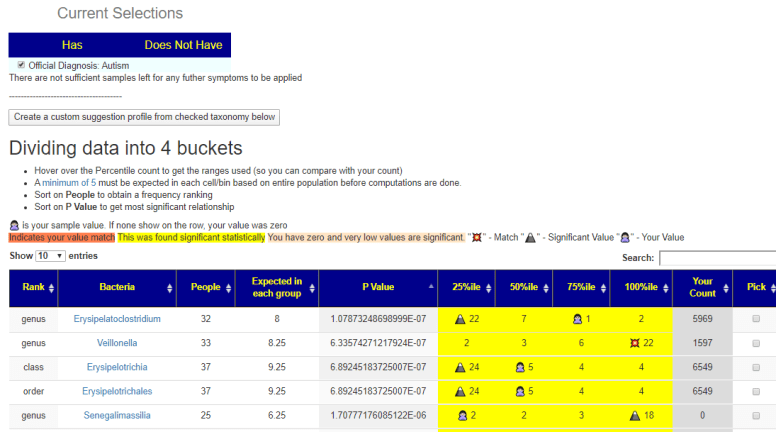 I went to Bacteria Symptom Explorer Plus (Autism via Citizen Science is there). And custom picked these 4 bacteria taxa that we want to increase. I then create a [Hand Picked Taxa Suggestion].