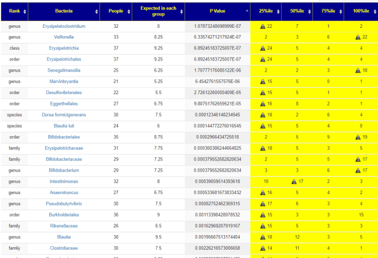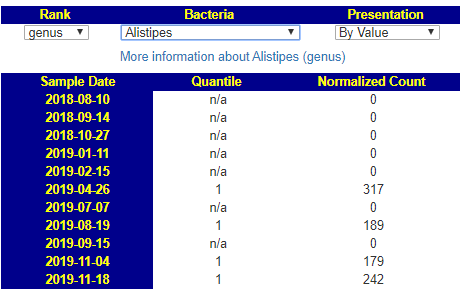 Alistipes – Low. Clicking thru I see 85% have measurable quantities. For 7/11 samples having none (and when it does, very low)… suggests it’s absence may be significant.