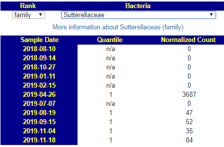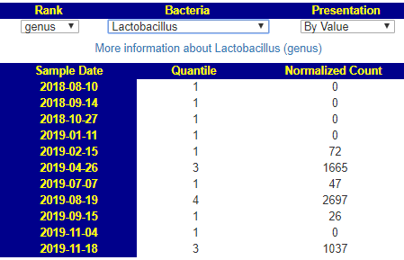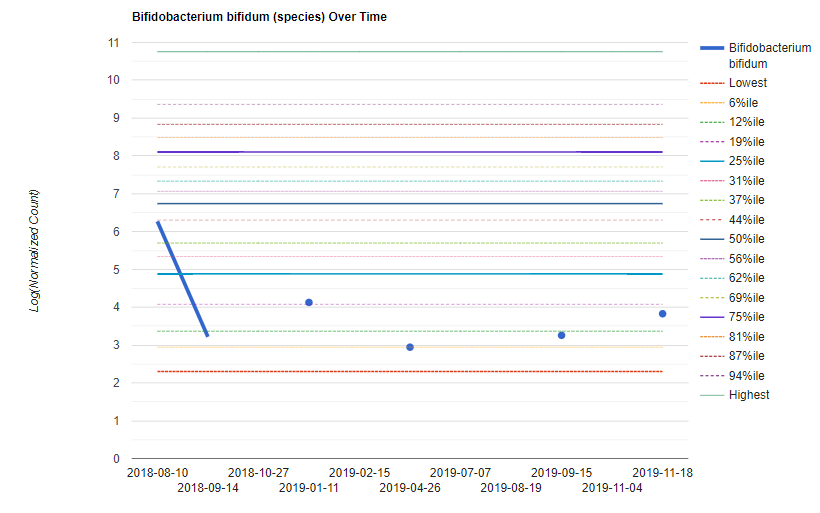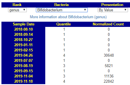 A reader granted permission to review their child with autism microbiome over time, especially in light of my recent post Technical Study on Autism Microbiome. It presents an opportunity to better understand the dynamics of the microbiome with autism. I say dynamic, because the microbiome keeps changing — sometimes in minor ways, other times major. It is a moving target. This is the first part of several posts. There is a lot of data and some of it caused me to write new tools to answer some questions that arose. I believe that microbiome has significant impact on the severity of symptoms in autism.