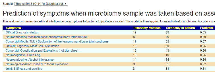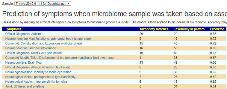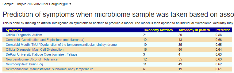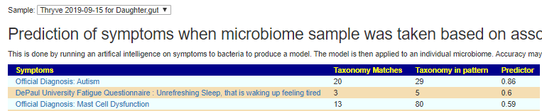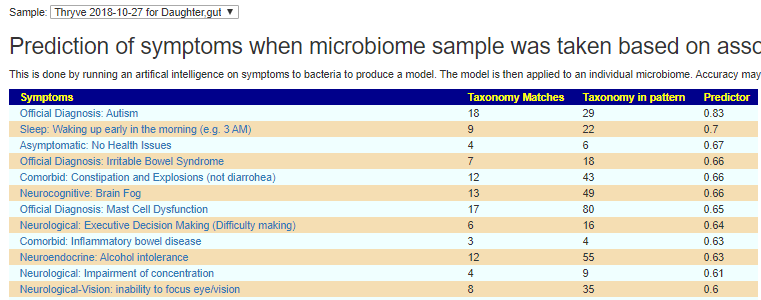 Going thru the samples, using 0.6 as the cut off point for predictions. Fatigue may manifest itself as irritability. Every single microbiome sample had autism as #1 predicted symptom.