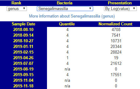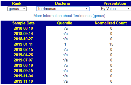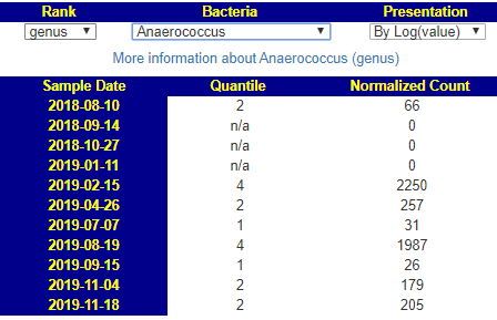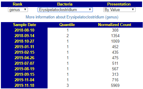 Terrisporobacter Medium Low. Clicking this link I see 75% of samples have measurable amounts. For 10/11 samples to have none suggests some significance to its absence.