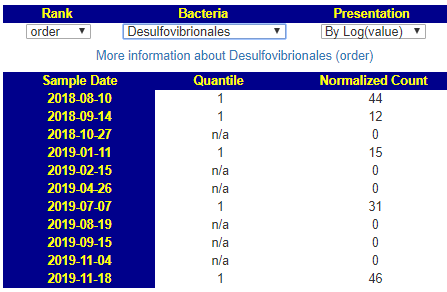 Desulfovibrionales (Order) Low. This is reported in 92% of this lab’s sample. 6/11 having none is a low probability event.