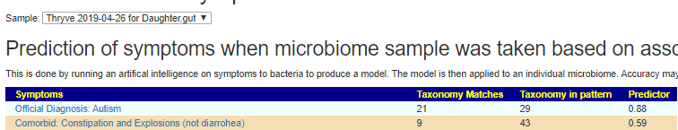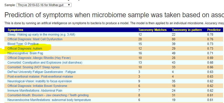The mother’s microbiome had a surprise… a weak autism-like profile. Only 12 matches (the daughter ranged from 14-21). The mother when she first emailed gave a “no health issue” description.