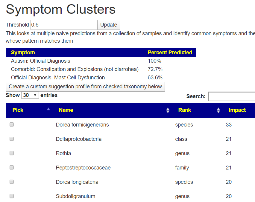 In Child Autism microbiome over time – Part 1 , I reviewed the predicted symptoms for each samples and saw a regular pattern. As a result, I wrote some code to cluster the taxa from most common predicted symptoms… in english, identified the bacteria that appears to be causing most of the regular predictions.
