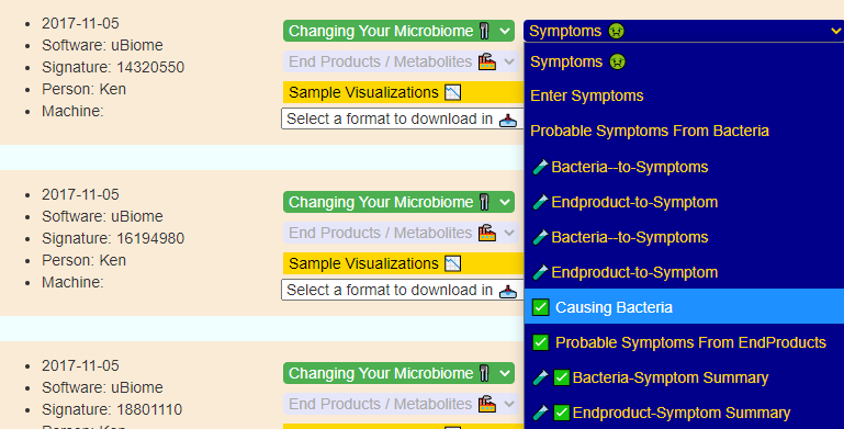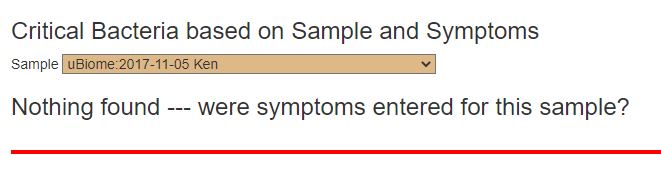 This week, I came up with a elegant solution. Using the microbiome sample and the symptoms that have been entered, I crafted some AI to generate suggestions based on the strong statistical relationships we have discovered via citizen science. Preliminary results are looking good.