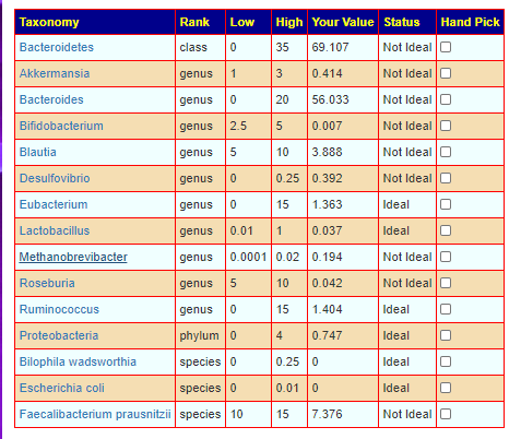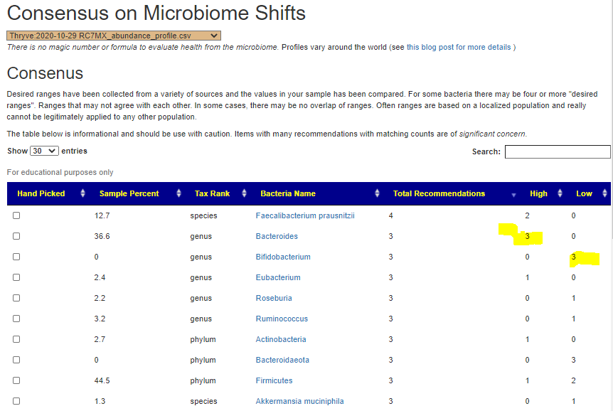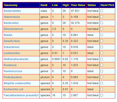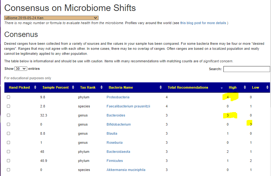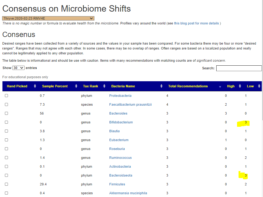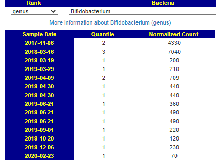 Proteobacteria was a major concern for being too high during ME/CFS, then dropped too low and finally dropped off the list (when it was in the range that everyone suggests). The other dominant item of concern is Bifidobacterium which has been consistently close to zero (< 1%). This needs some research, because age is a factor [The faecal flora of man. II. The composition of bifidobacterium flora of different age groups]