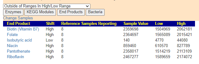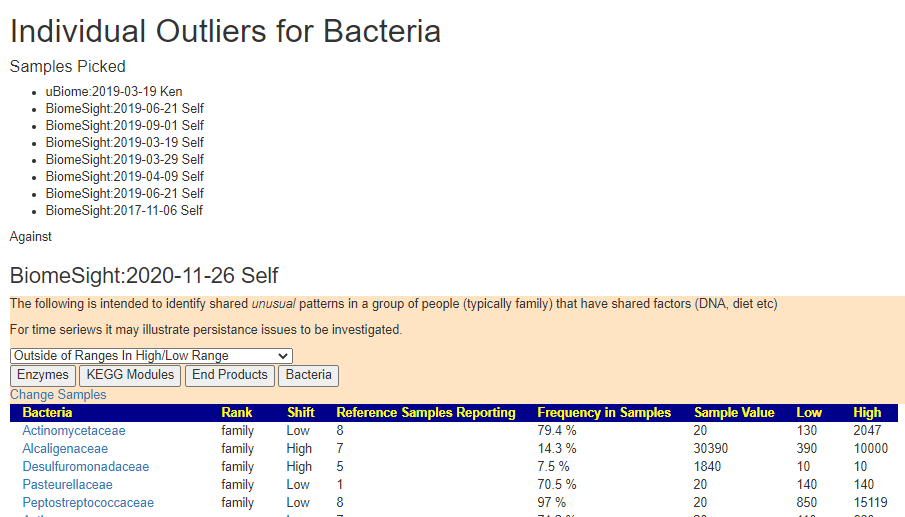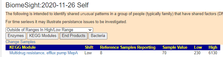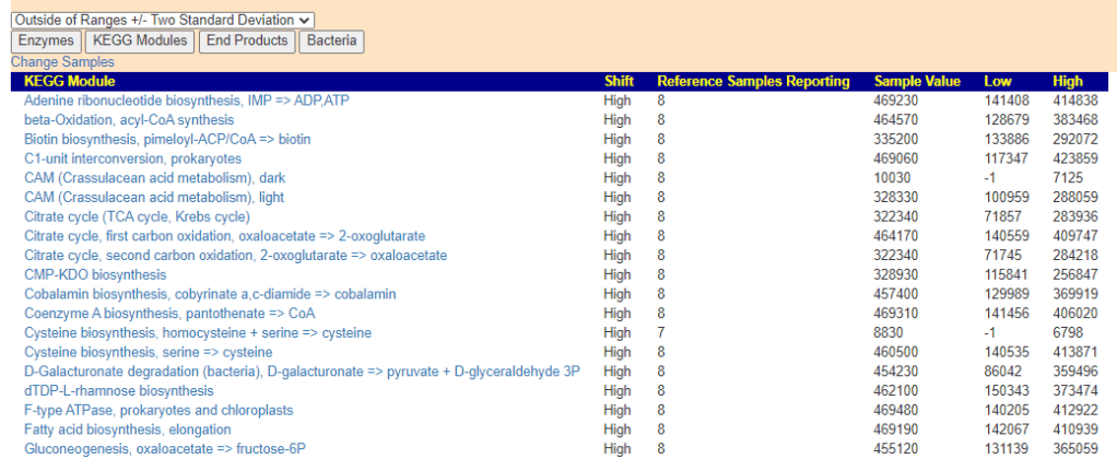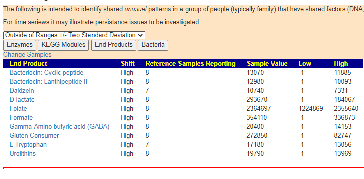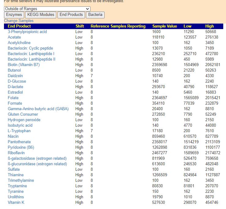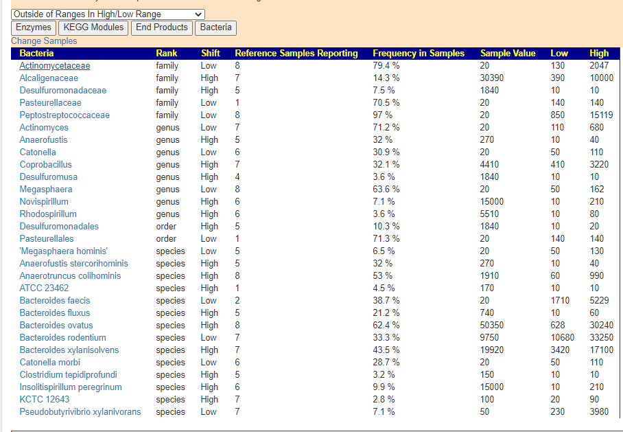 This tool gives information on what changed… what it means and what to do with it is a different question. At the moment, I would suggest reading and researching items that seems to be major. The microbiomeprescription.com site gives suggestions on modifying bacteria numbers.