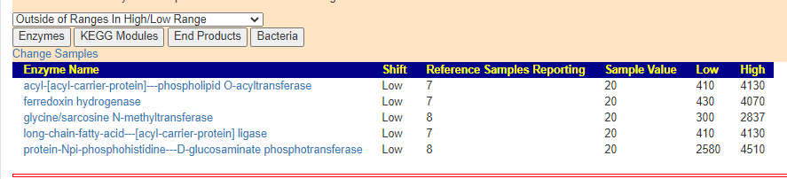 I picked several prior samples and my latest sample for comparison. Note that Reference Samples Reporting if less than all (in this case 8), it means that there were some zero values (and thus, you may wish to ignore shifts being low for those).