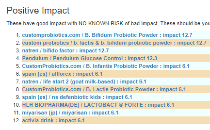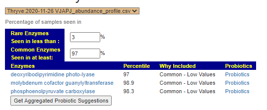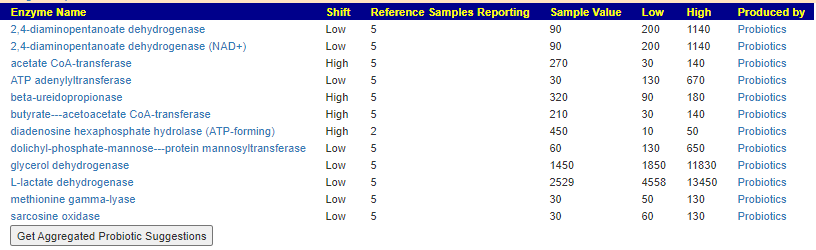 In comparing the two sets of suggestions, we see some similar items with a count of 3/3 or 15/15. These are probiotics that produces all of the low enzymes