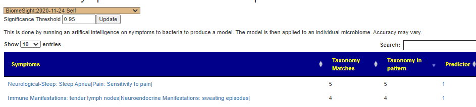 The most probable predicted symptoms from the microbiome samples are below — they are very correct except for age.