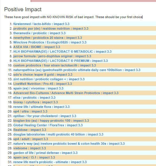 We have a conflict on triphala. One subset of bacteria says to use it, a different subset says not to use it. Given that it’s the highest value in both cases we need to do an experiment. I would advocate doing triphala for 4-6 weeks to see if it improves neurological issues, then stop it and re-evaluate.