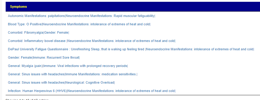 This person has an interesting set of symptoms for ME/CFS. 40 yo male. I am following the same pattern as the two previous analysis. Every ME/CFS person share some factors and are different in other factors. There is nothing that works for all ME/CFS people.