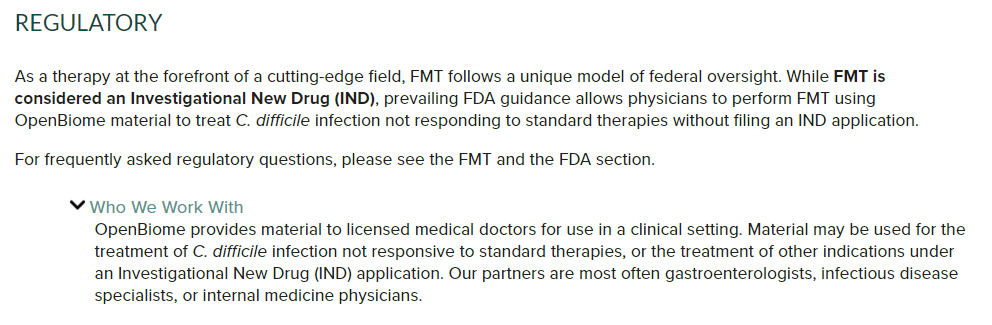 “However, while current FDA regulations permit use of FMT for treating C. difficile infections that