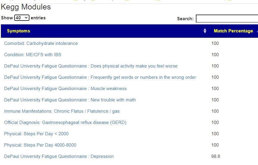 While core supplements has largely been replaced by KEGG, it is still available. There was only one supplement computed that strongly suggests supplementation, DAO. There is no studies on PubMed for CFS and DAO, however DAO does reduce histamine levels — it is a possible experiment to try. I know several people with ME/CFS that have histamine issues, in some cases, severe hay fever. There is some literature in this direction: