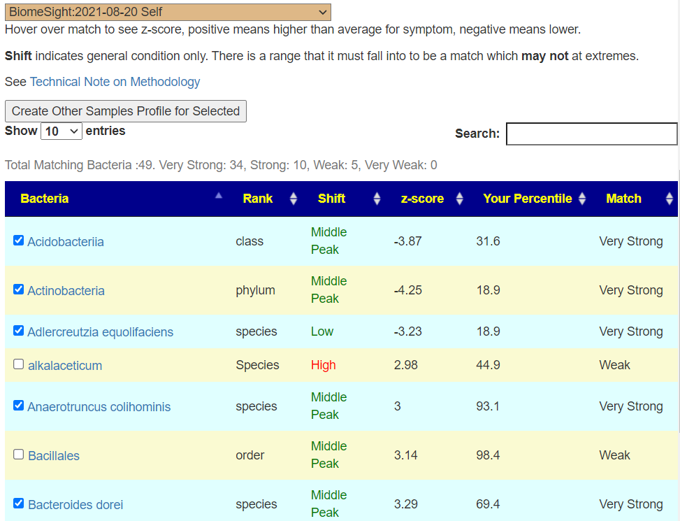 This takes me to a page showing the bacteria involved. We have 44 out of 49 bacteria having a strong or better match.