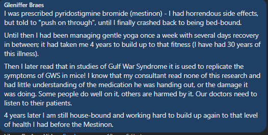 A reader pointed me to Mestinon on ME-Pedia.org which presents some interesting reads. My ground rules have always been to rely on gold standard sources, that is, peer-reviewed PUBMED articles.