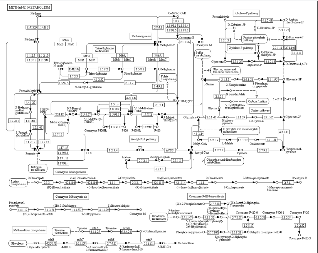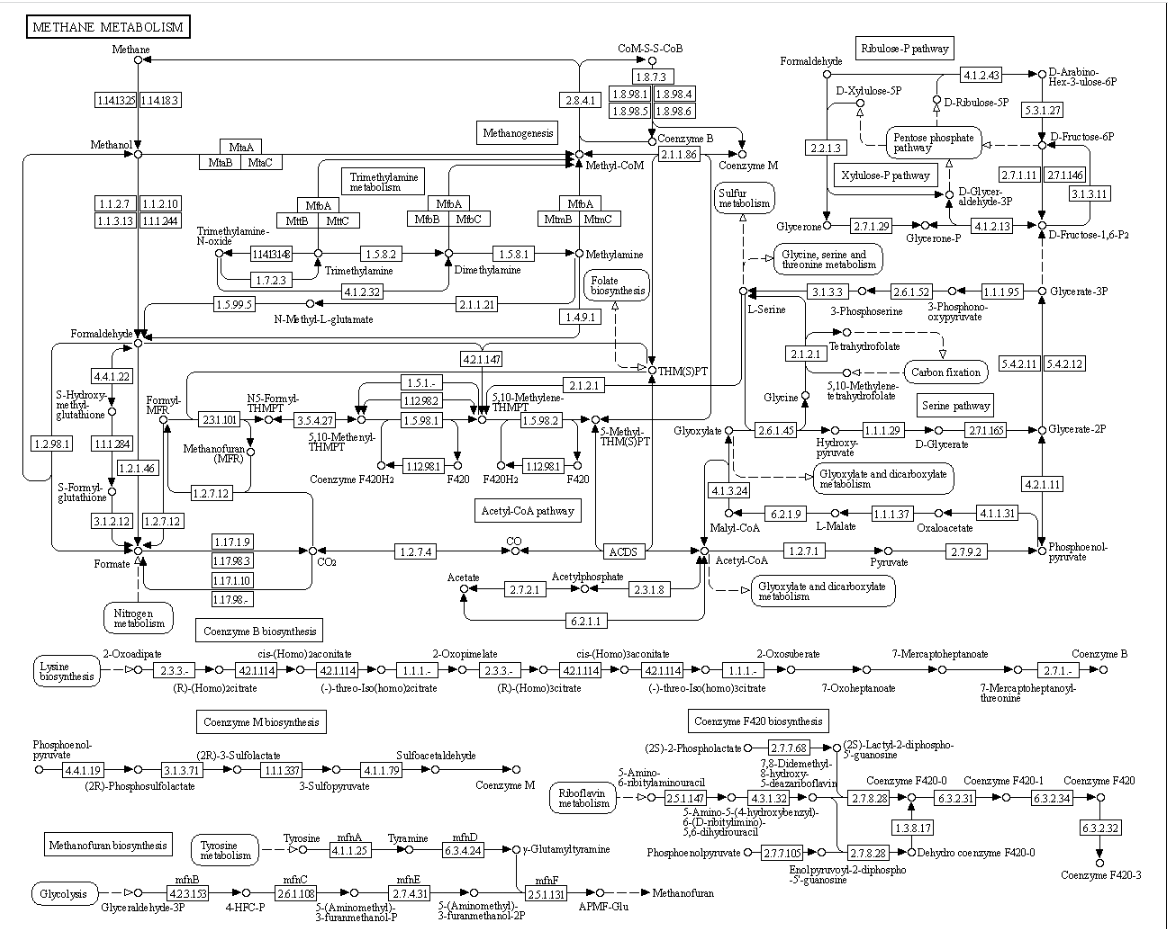 Concerning the enzymes listed above, I will leave it to the reader to see where they occur in the following example of a KEGG metabolism diagram.